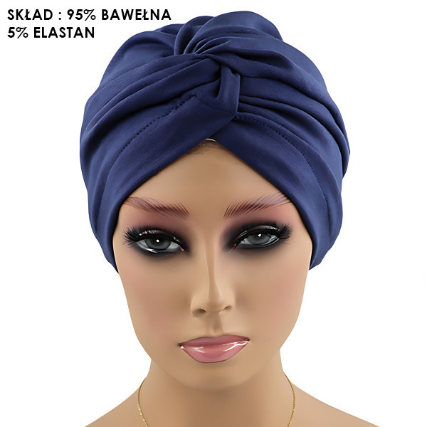 Turban granatowy wykonany z dzianiny bawełnianej. Skład: 95% bawełna i 5% lycra.