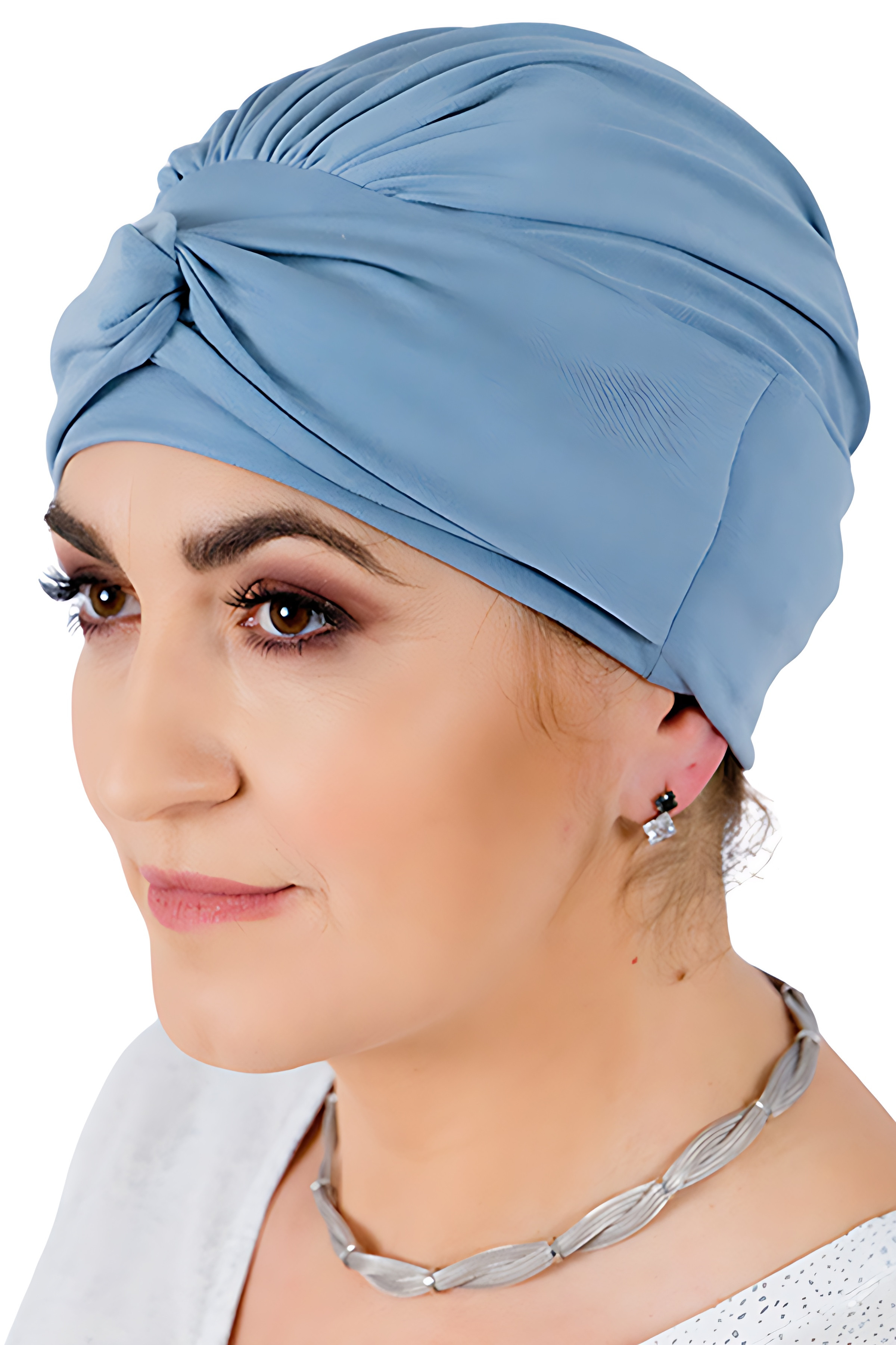 Turban jest rozciągliwy, co zapewnia idealne dopasowanie do każdego kształtu głowy bez uciskania jej. Jest wyjątkowo delikatny dla skóry, idealny dla osób z wrażliwą skórą po chemioterapii, jak i dla kobiet z włosami, jako elegancki element codziennej garderoby.