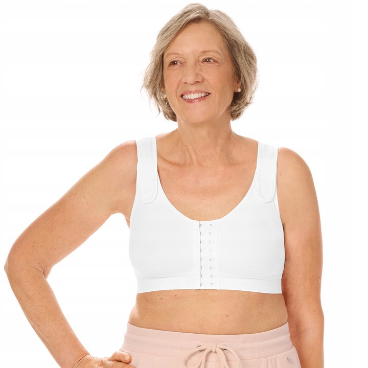 Miękki i komfortowy biustonosz pooperacyjny Sarah to idealny wybór dla kobiet w okresie rekonwalescencji po operacji piersi lub klatki piersiowej. Zapewnia on komfortowe wsparcie i pomaga zmniejszyć obrzęk i ból. Wykonany z miękkiej, oddychającej bawełny, posiada płaskie szwy i profilowane miseczki, które nie podrażniają skóry. Zapinany z przodu na haftki i rzepy dla łatwego zakładania i zdejmowania. Można zostosować wraz z miękkim pasem na środku pleców do mocowania pasa kompresyjnego Amoena (sprzedawanego oddzielnie).
