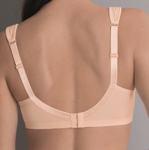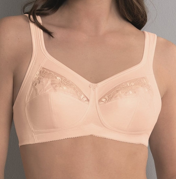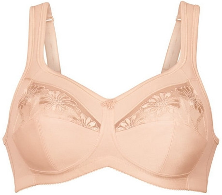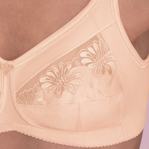 Dzięki obustronnym kieszonkom na protezy, wykonanym z miękkiej i oddychającej dzianiny dżersejowej, model ten jest niezwykle wygodny i delikatny dla skóry. Szerokie, podszyte pianką ramiączka zmniejszają nacisk na ramiona, a pełne miseczki z haftowanym tiulem optycznie wyrównują obie strony biustu, dodając biustonoszowi lekkości i kobiecego wyglądu.