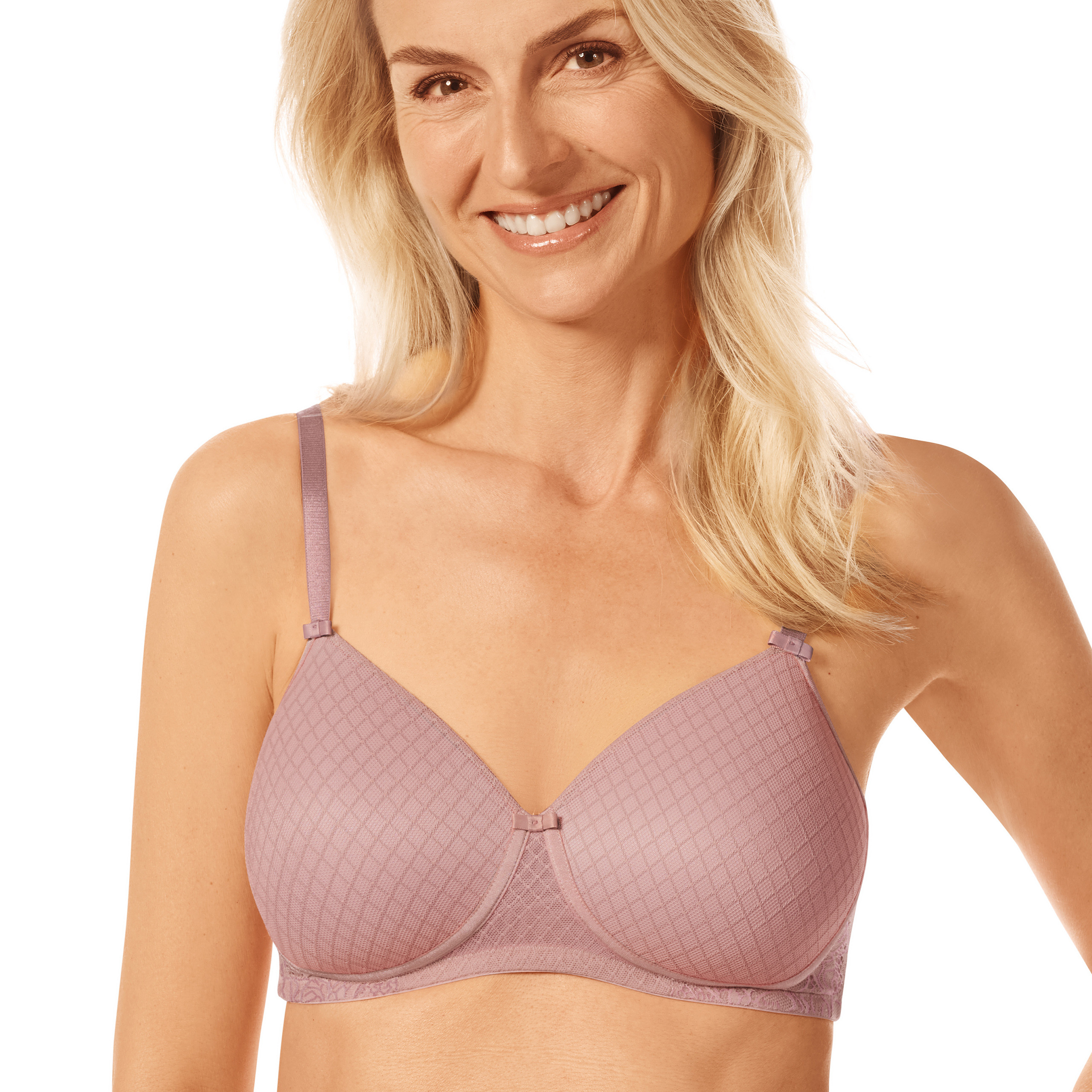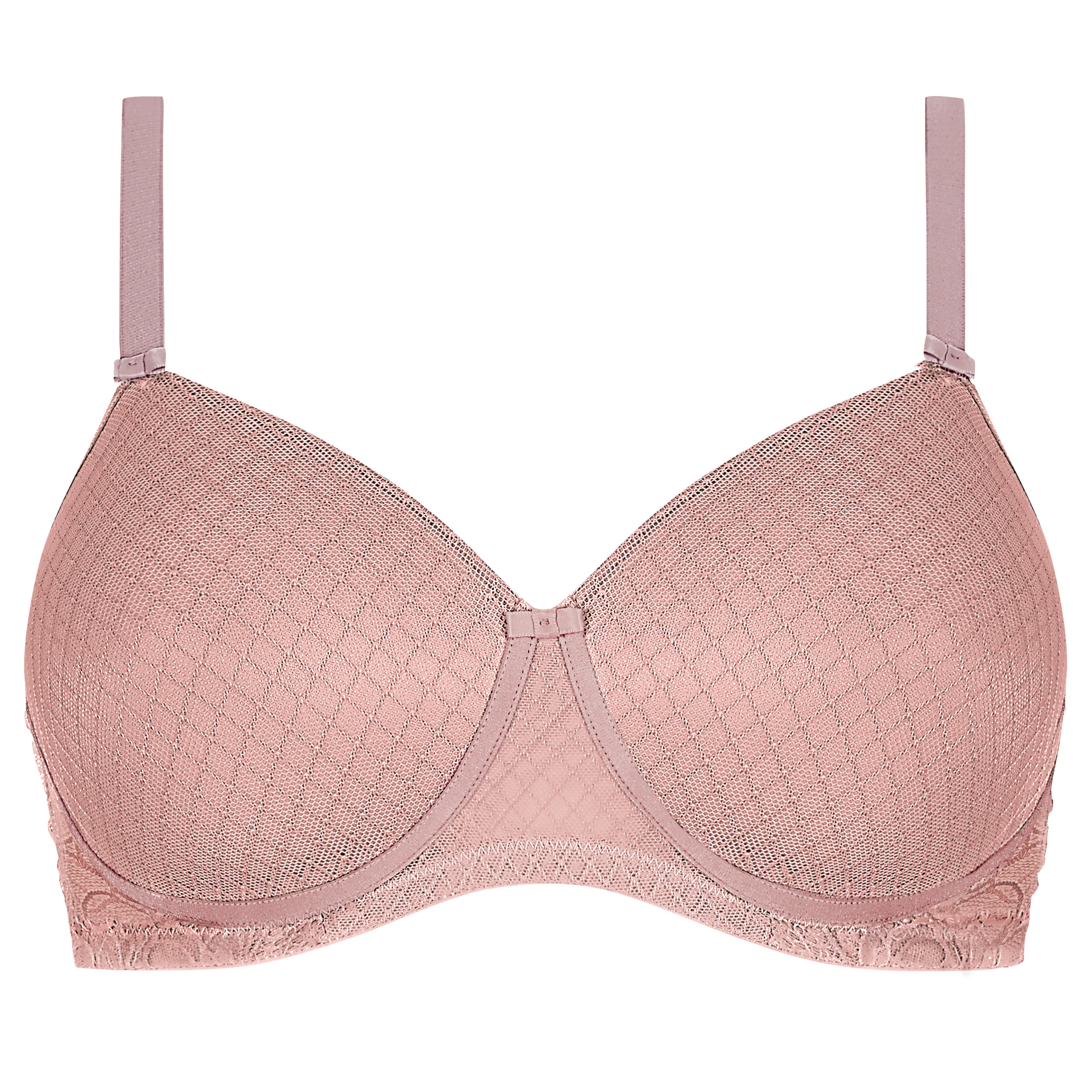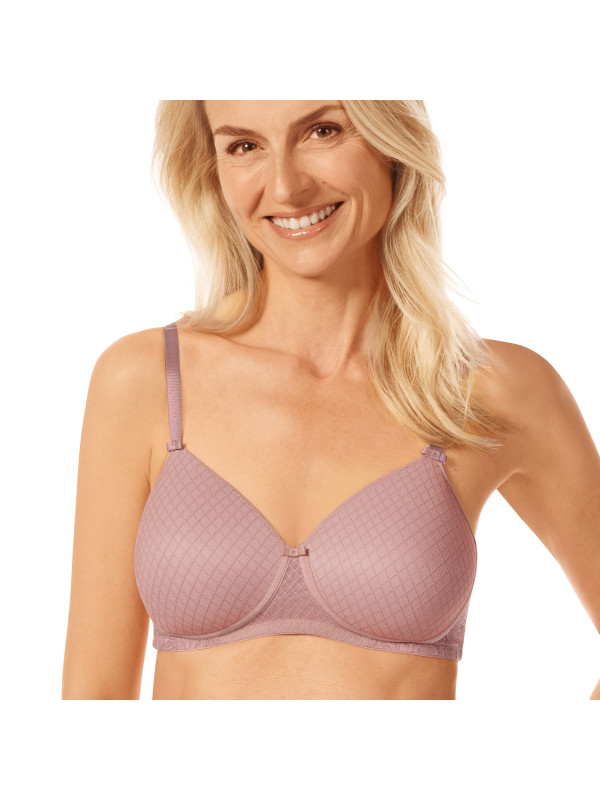 Biustonosz usztywniany bez fiszbin Danielle SBP oferuje subtelny dwukolorowy efekt z kwiatową koronką i delikatną siateczką w kształcie rombów. Posiada obustronne kieszonki do protez piersi.