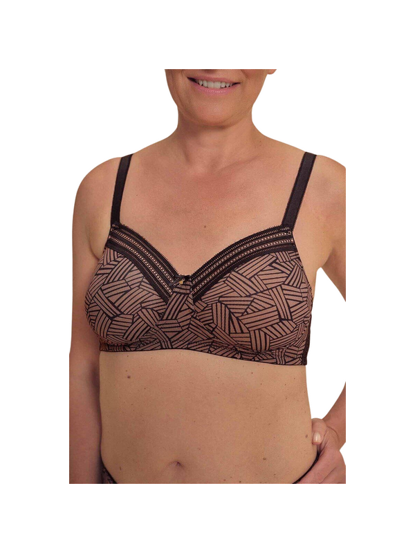 Nowoczesny, koronkowy nadruk w połączeniu z ozdobnymi paskami przy dekolcie i po bokach sprawia, że biustonosz wygląda jak klasyczna, elegancka bielizna - a nie wyrób medyczny.