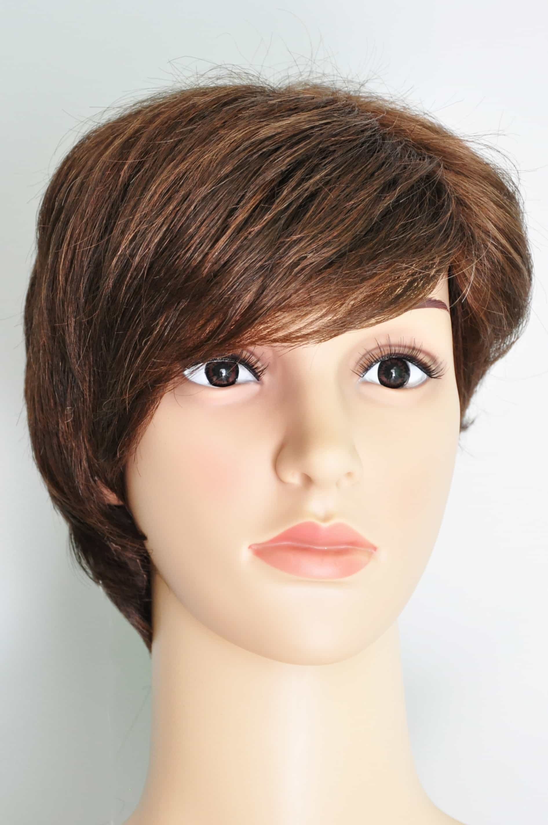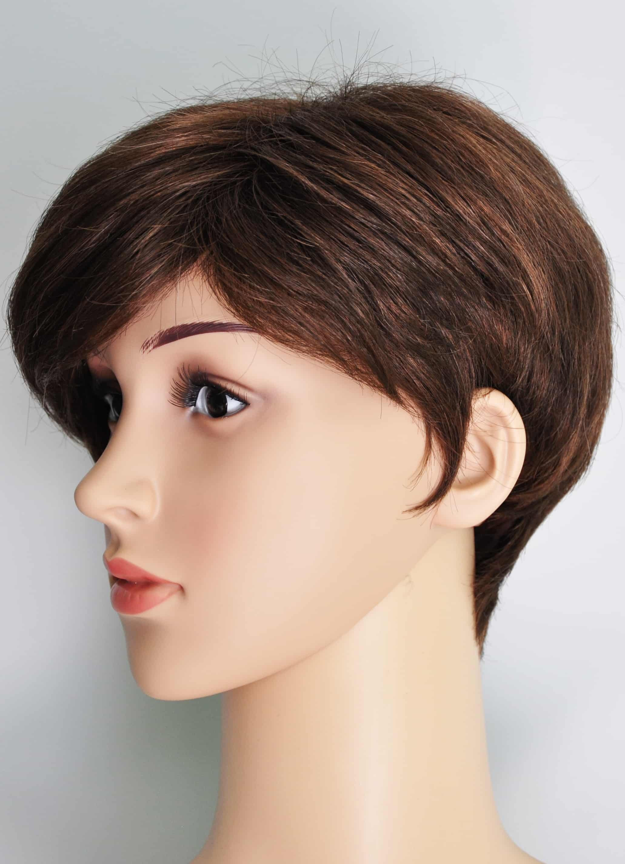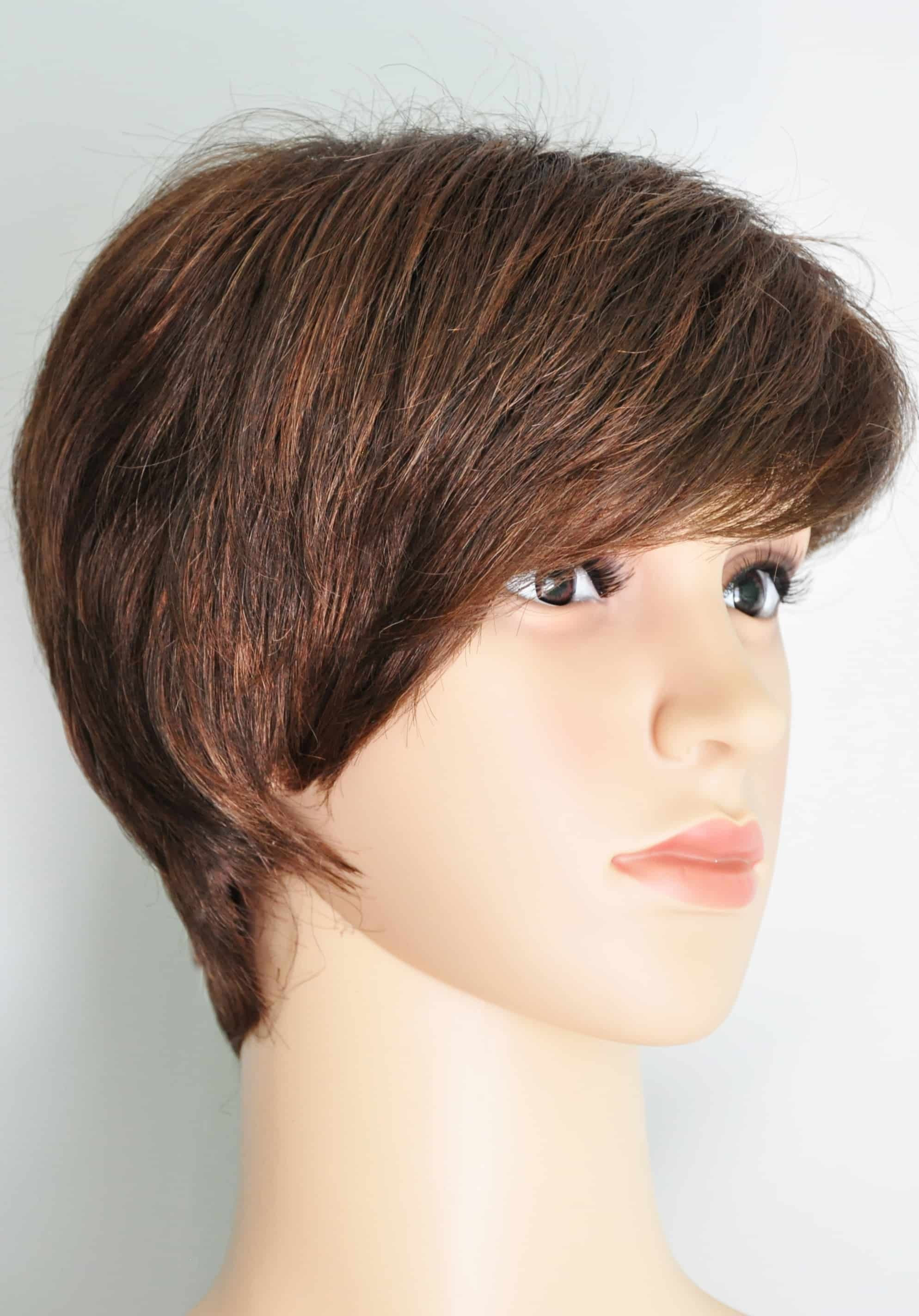 ⭐️ Asymetrycznie obcięte krótkie włosy z dłuższym prawym bokie w brązowym kolorze.