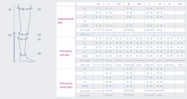 ❤️ System rozmiarów z kodami barwnymi i wskaźnik na taśmie trzymającej są pomocne podczas ustalania rozmiaru i zakładania pończoch