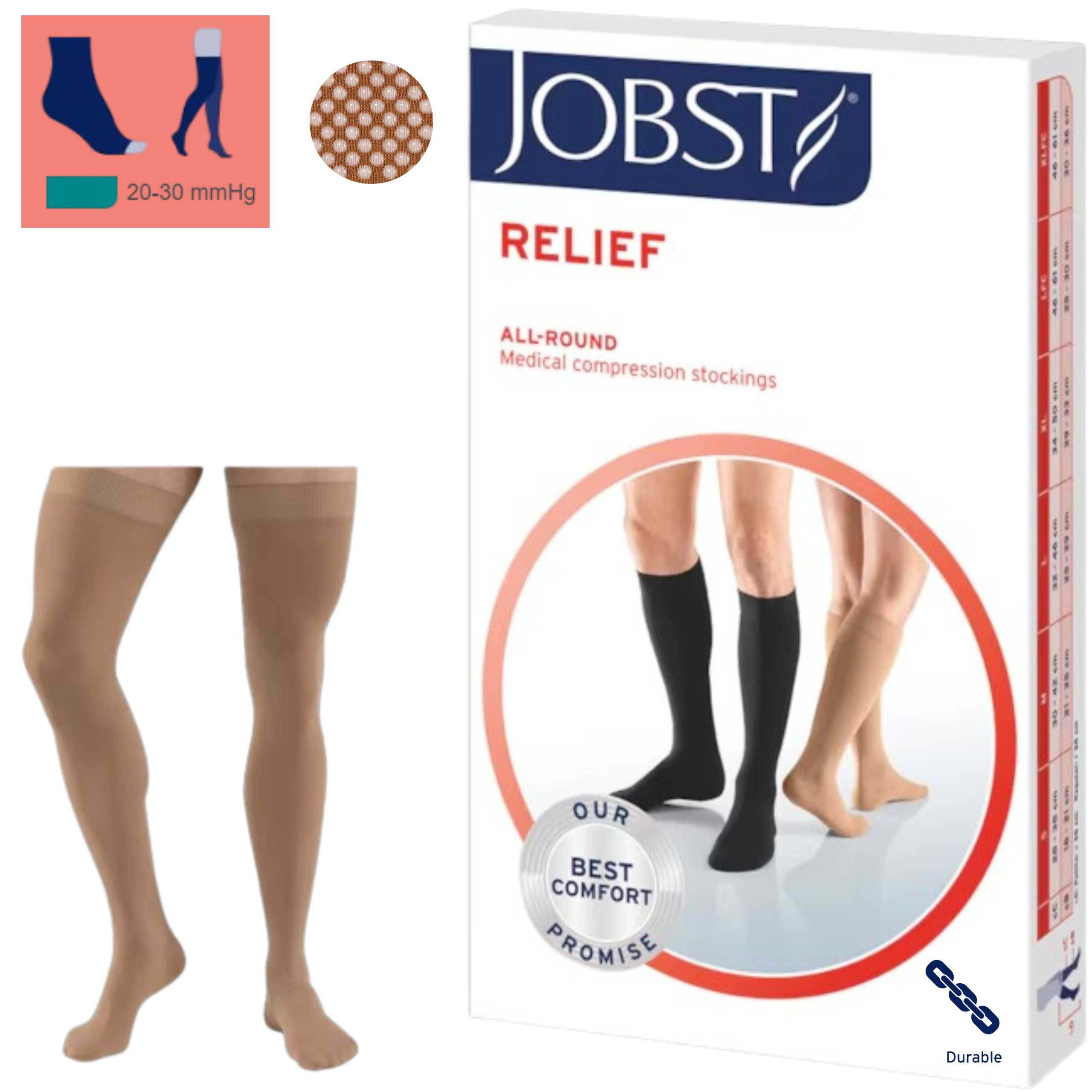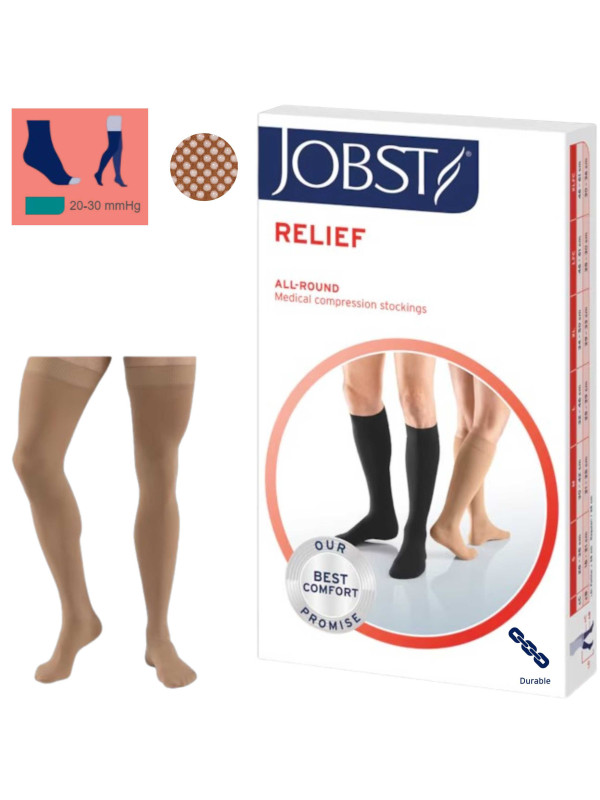 Pończochy uciskowe JOBST® Relief beżowe z otwartymi palcami to wyrób medyczny dla osób potrzebujących skutecznego wsparcia w leczeniu i profilaktyce chorób żył. Dzięki stopniowanemu uciskowi poprawiają krążenie, zmniejszają obrzęki i redukują uczucie ciężkich nóg. Neutralny beżowy kolor sprawia, że są dyskretne pod ubraniem, a otwarte palce zapewniają wentylację i swobodę, co docenią osoby z wrażliwymi stopami i w cieplejsze dni.