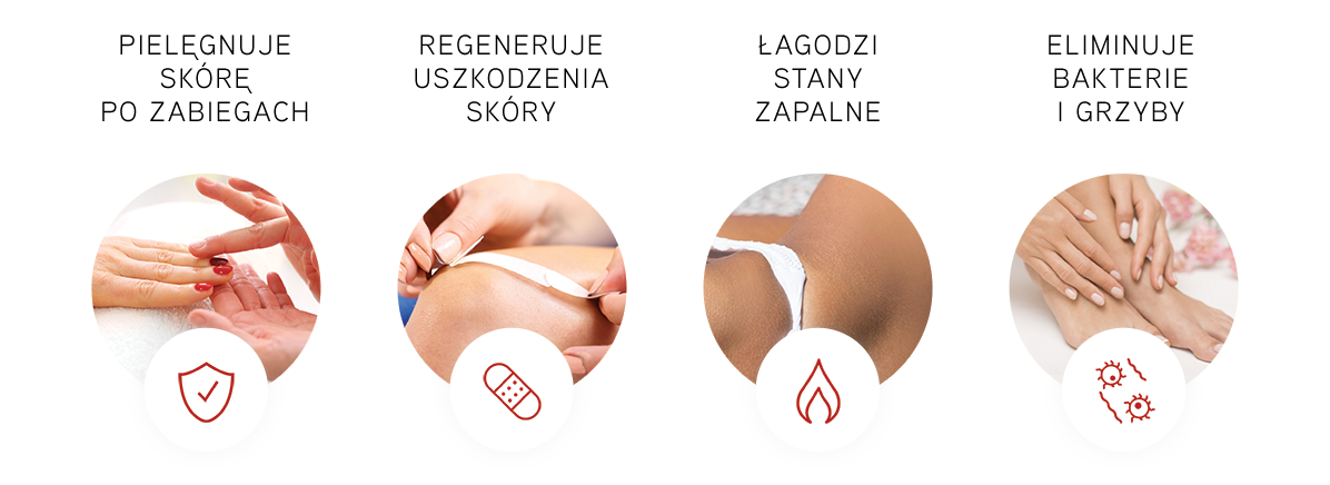 Produkt działa kojąco przy podrażnieniach, przyśpiesza regenerację i rewitalizację skóry. Jednocześnie zabezpieczając przed rozwojem infekcji oraz wspomaga ich ustępowanie.