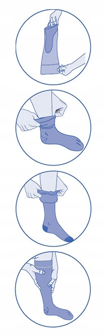 4. Zaczynając od dołu - naciągnij równomiernie wyrób na nodze, wywijając go jednocześnie na prawą stronę, rób to stopniowo kawałek po kawałku, bez szarpania i nadmiernego naciągania wyrobu.