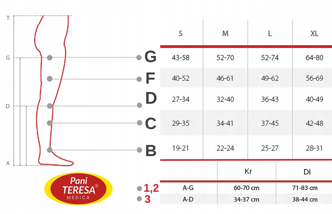 Odpowiednio dobrany rozmiar, jest podstawą właściwego działania terapeutycznego produktów uciskowych. W tym celu należy zmierzyć obwód obu nóg w miejscach wskazanych w tabeli rozmiarów.