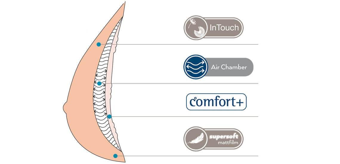 Protezy Adpat Air pozwalają wszystkim kobietom, które zmagają się z wahaniami wagi na wyregulowanie protezy w szybki sposób. Zewnętrzna strona zawiera silikon InTouch o 40% lżejszy niż w standardowej, klasycznej protezie.