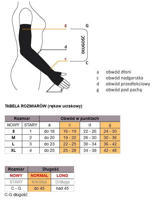 Pomiaru najlepiej dokonywać rano, w ciągu dnia kończyny puchną. Należy dokonać pomiaru we wszystkich wskazanych punktach pomiarowych. Umiejscowienie punktów pomiarowych przedstawia zdjęcie. Dobierając rozmiar, najważniejsze znaczenie mają wartości pomiarowe w punktach c (obwód nadgarstka) i g (obwód ramienia).