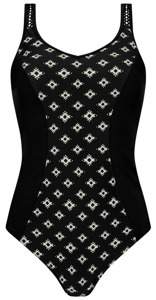 Odkryj luksusowy komfort i funkcjonalność w eleganckim jednoczęściowym stroju kąpielowym Amoena Palermo FB 71746. Ten model został stworzony z myślą o kobietach po mastektomii, które cenią sobie nie tylko piękny wygląd, ale także doskonałe wsparcie i bezpieczeństwo w wodzie. Etniczny wzór na tle klasycznej czerni nadaje całości wyrafinowanego stylu, a dopracowane detale sprawiają, że jest to strój, który łączy w sobie modę, technologię i wygodę.