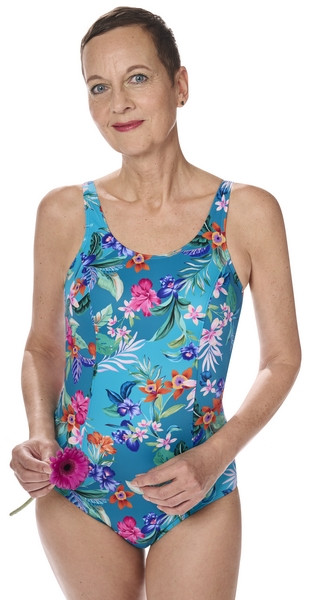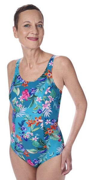Amoena Alvor FB 71768 to elegancki, jednoczęściowy kostium kąpielowy stworzony z myślą o kobietach po mastektomii. Jego piękny, tropikalny wzór w turkusowych odcieniach, wypełniony egzotycznymi kwiatami, przyciąga wzrok i dodaje pewności siebie. Kostium nie tylko zachwyca wyglądem, ale również zapewnia wygodę i bezpieczeństwo dzięki specjalnym rozwiązaniom dedykowanym kobietom noszącym protezy piersi.